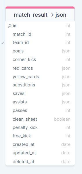 그리고 win,lose,draw 대신 goal 컬럼을 넣어 승부 결과가 필요할 때에는 경기 ID로 홈팀과 어웨이 팀 을 불러와서 계산하여 보여주기로 했습니다. 마지막으로 goal과 card들, saves 등 몇몇 컬럼에 타입을 json으로 변경하였는데, 이는 경기 결과 저장시 해당 컬럼을 증가하게 만든 사용자 ID를 넣게 하기 위해서였습니다.